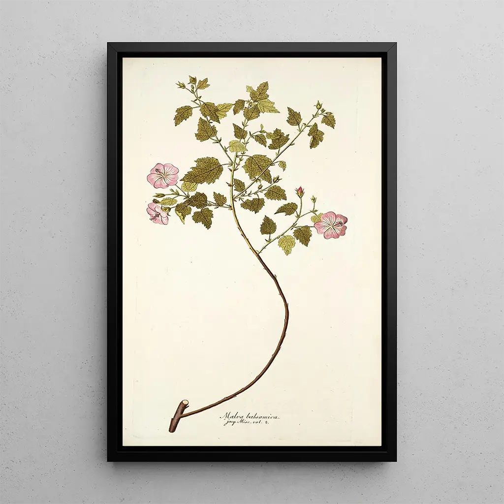 Den kunsttryk af Malva balsamica, værk af Nikolaus Joseph Freiherr von Jacquin, tager os med ind i en verden af blidhed og præcision. Dette lærred, rigt på detaljer, fremhæver plantens skønhed med pastelfarver, der fremkalder ro. Nuancer af grøn og rosa blander sig harmonisk, hvilket skaber en beroligende atmosfære. Akvarelteknikken, anvendt med mesterlighed, gør det muligt at gengive gennemsigtigheden af blomsterbladene og teksturen af bladene, hvilket inviterer til naturens fordybelse. Hvert element er omhyggeligt gengivet, hvilket vidner om et opmærksomt og respektfuldt blik på den vegetale verden.