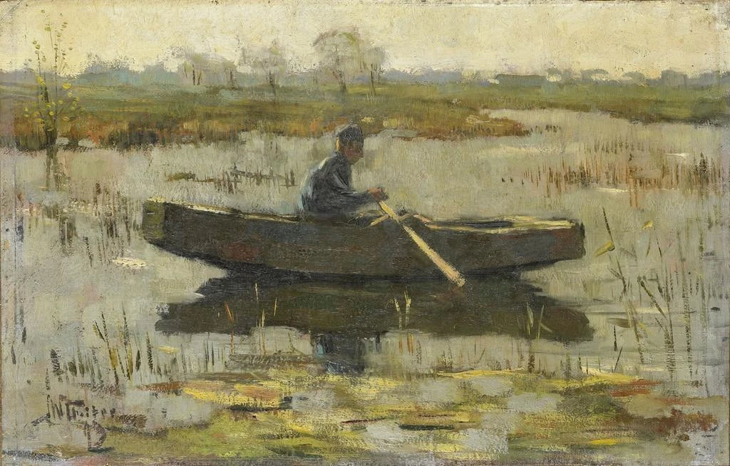L'œuvre "Homme dans une barque" af Herman Wolbers fremkalder en rolig scene, hvor en mand, alene på sin båd, synes at flyde i en verden af ro. Nuancer af blå og grøn blander sig harmonisk, hvilket skaber en beroligende atmosfære. Kunstnerens teknik, der bruger flydende penselstrøg, giver liv til vandet, mens himlen prydes af bløde, næsten æteriske nuancer. Dette lærred inviterer til eftertanke, drømmende refleksion og transporterer betragteren til et suspendet øjeblik i tiden, hvor naturen og mennesket eksisterer i perfekt harmoni.