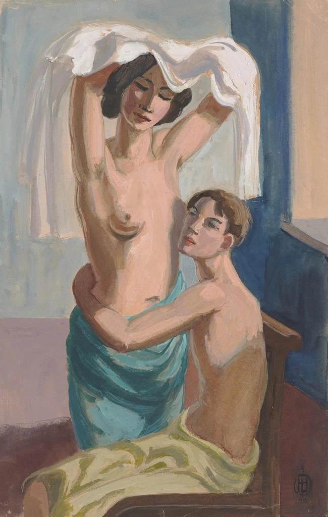Kunsttryk | Mand sidder og omfavner en nøgne kvinde stående - Hermann Lismann