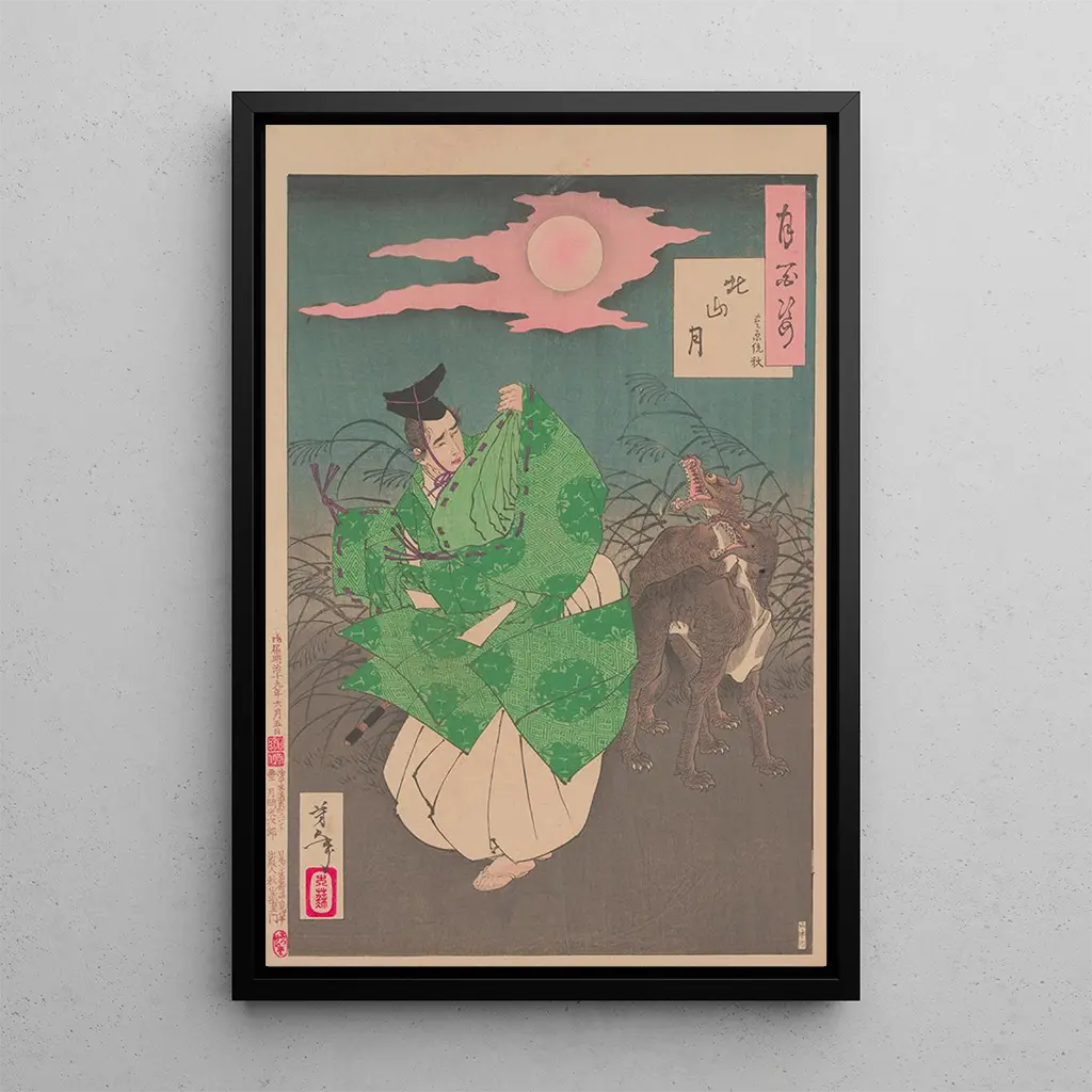 I denne kunsttryk af Lune de Kitayama fanger Tsukioka Yoshitoshi essensen af en fredelig nat, oplyst af den blide månelys. De delikate nuancer af blå og sølv smelter harmonisk sammen, hvilket skaber en rolig og eftertænksom atmosfære. Kompositionen, rig på detaljer, inviterer betragteren til at dykke ned i en drømmeverden, hvor natur og kunst mødes. Silhuetterne af træerne skiller sig ud mod den stjernespækkede himmel, mens den majestætiske måne synes at vogte over dette fortryllende landskab. Hvert element i lærredet fremkalder en følelse af ro og skønhed, hvilket gør dette værk til et ægte kunstnerisk juvel.
