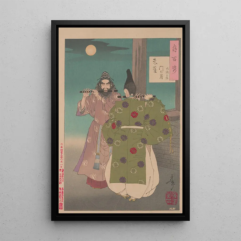 "Lune de la porte Suzaku" er et ikonisk kunsttryk af Tsukioka Yoshitoshi, der fanger magien i en nat oplyst af månen. Kompositionen viser en delikat scene, hvor den sølvfarvede lysrefleksion spejler sig på de naturlige elementer og skaber en drømmeagtig og fredelig atmosfære. De bløde farver og de omhyggelige detaljer vidner om kunstnerens mestring inden for ukiyo-e kunstformen. Dette kunsttryk fremkalder ikke kun naturens skønhed, men også en følelse af indre fred, og inviterer betragteren til at fordybe sig i denne natlige scene.