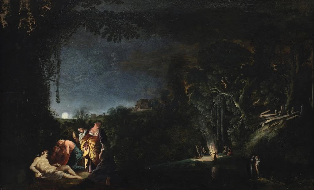 Landskab med måne med mytologisk motiv: en drømmende flugt under måneskin.