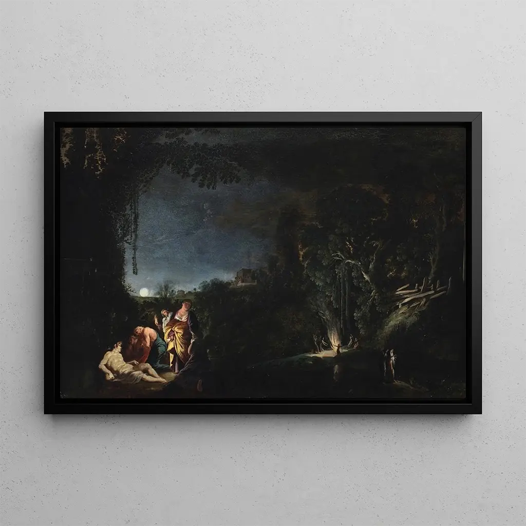 Dette fængslende kunsttryk af Moyses van Uyttenbroeck fremkalder en mystisk atmosfære, hvor månen lyser op fortryllende landskaber. De sølv- og blålige nuancer blander sig harmonisk, hvilket skaber en slående kontrast til de mytologiske motiver, der fylder lærredet. Kunstnerens teknik, der kombinerer finesse og minutøse detaljer, giver mulighed for at dykke ned i en verden, hvor drøm og virkelighed smelter sammen. Hvert element, fra skummende skyer til mytiske silhuetter, inviterer til dyb refleksion og tilbyder en flugt til en magisk verden.
