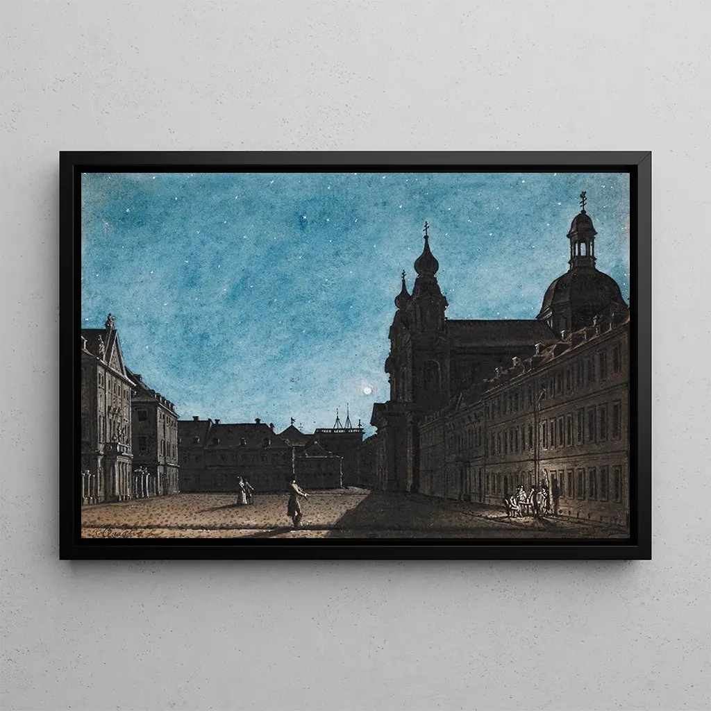 La kunsttryk de La place du théâtre de Mannheim au clair de lune nous plonge dans une atmosphère envoûtante, où la lumière argentée de la lune éclaire délicatement les façades des bâtiments. Les nuances de bleu et de gris se mêlent harmonieusement, créant un contraste saisissant avec les touches dorées des lumières artificielles. La technique de Giuseppe Quaglio, qui utilise des détails minutieux et une perspective soigneusement étudiée, donne vie à cette scène nocturne. Les ombres dansent sur les pavés, invitant le spectateur à imaginer les murmures des passants et les rires des spectateurs sortant d'une représentation.