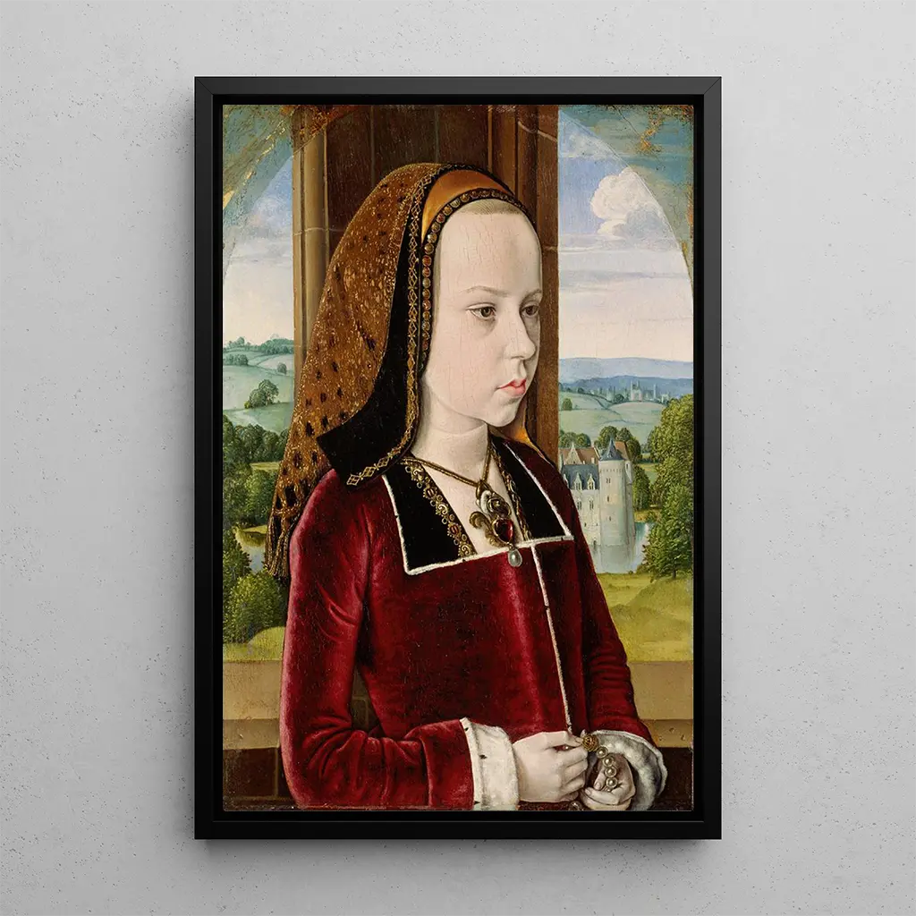 Kunsttrykket af Marguerite d'Autriche, udført af Jean Hey, fører os ind i den raffinerede verden af renæssancen. Dette værk skiller sig ud gennem sin harmoniske komposition og sine delikate farver, hvor nuancer af blå og guld smelter subtilt sammen. Teknikken med oljemaling gør det muligt at gengive detaljerne i prinsessens tøj og smykker med bemærkelsesværdig præcision. Atmosfæren, der udspringer af dette maleri, er præget af ro og adel, hvilket inviterer betragteren til at beundre skønheden og værdigheden af motivet. Marguerite, afbildet med en blid og eftertænksom udtryk, indkapsler elegance og kvindelig magt fra sin tid.