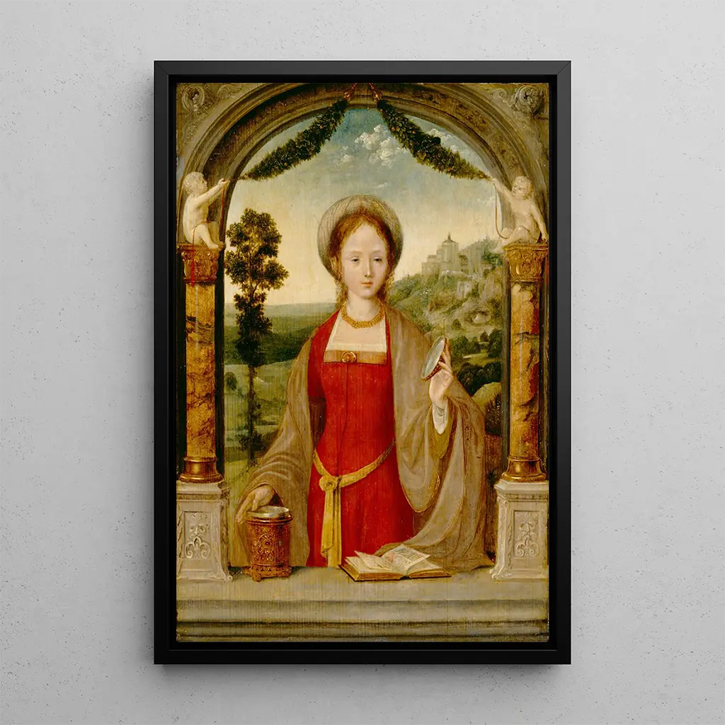 I denne fængslende fremstilling præsenterer Quentin Massys os for Marie Madeleine i et øjeblik af dyb eftertanke. De varme farver og de delikate skygger skaber en intim atmosfære, der fremhæver kvindens udtryk, som synes at være fortabt i sine tanker. Massys' teknik, kendetegnet ved en slående realisme, fremhæver de subtile detaljer i Marie Madalenas ansigt og tøj. Dette kunsttryk fremkalder en atmosfære af mysterie og forløsning, og inviterer betragteren til at reflektere over denne ikoniske figurers åndelige rejse.