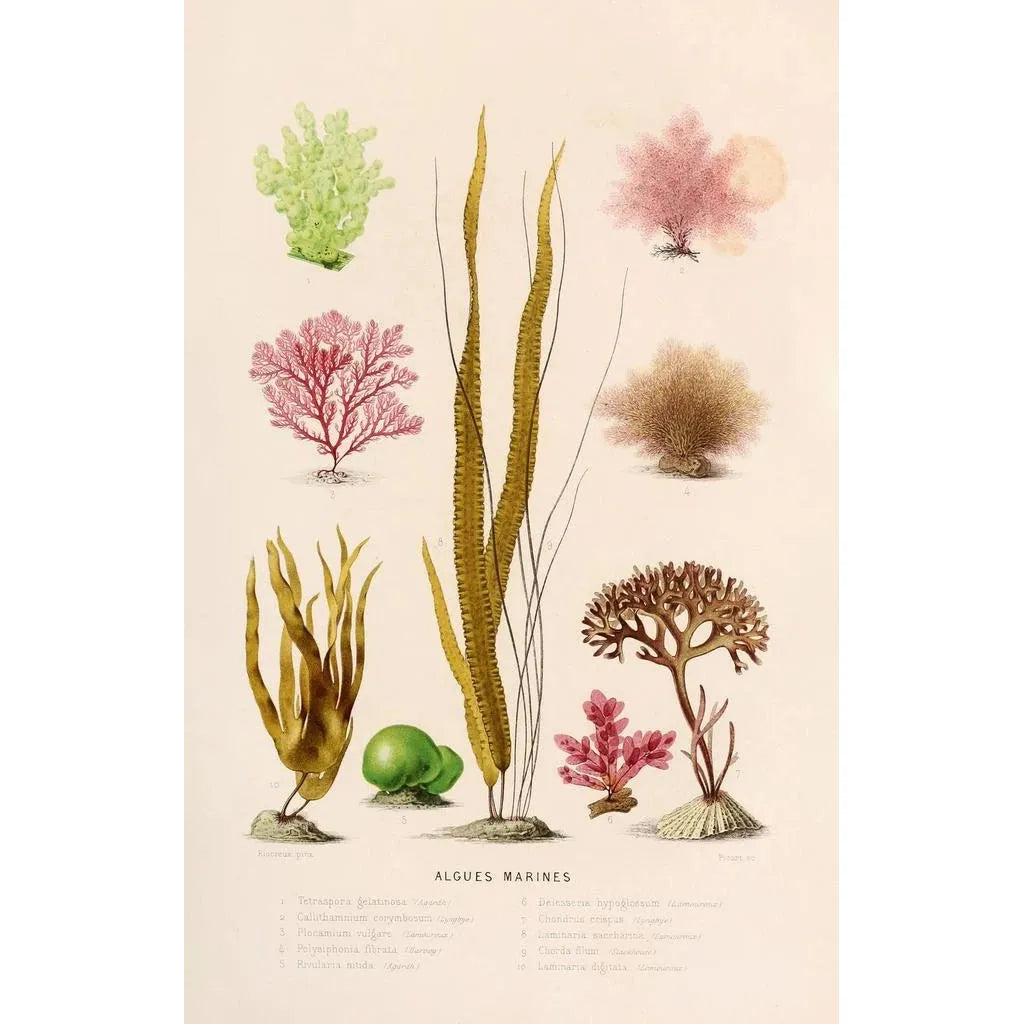 Den kunsttryk af Algues marines af Alfred Frödl tager os med til en fascinerende undervandsverden, hvor alger og vandplanter blander sig i en harmoni af farver og teksturer. Dette fængslende værk, både abstrakt og organisk, leger med nuancer af grøn, blå og gul, hvilket fremkalder flydende bevægelse og bølgernes dynamik. De snoede former og de fine detaljer i algerne skaber en atmosfære af mystik og ro, og inviterer betragteren til at udforske denne rige og levende undervandsverden.