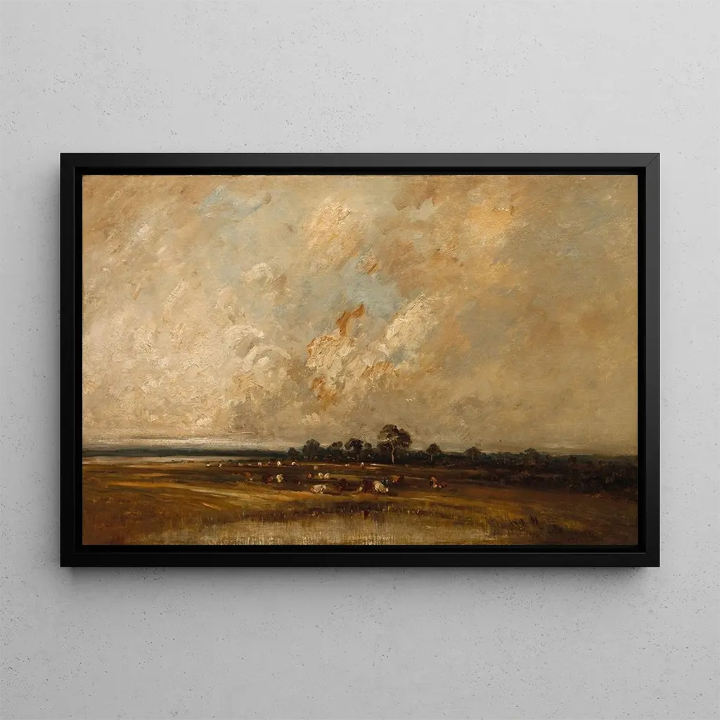 I dette fængslende værk dykker Jules Dupré ned i et fredeligt marsklandskab, hvor blid belysning reflekteres på de rolige vande. De grønne nuancer og blå toner blander sig harmonisk, hvilket skaber en atmosfære af ro og eftertanke. Teknikken med oliemaling, som er karakteristisk for kunstneren, gør det muligt at gengive teksturen af vegetation og vandets flydendehed med stor finesse. Dette maleri, en sand hyldest til naturen, inviterer betragteren til at drømme sig væk og værdsætte skønheden i de franske landskaber.