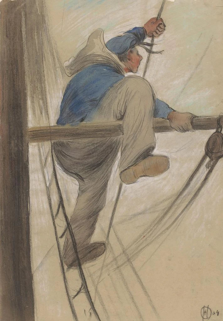 Kunsttrykket af "Matros i masten" er et dekorativt stykke, der vil berige dit hjem, uanset om det er i stuen, på kontoret eller i soveværelset. Dets trykkvalitet og trofasthed mod de originale farver sikrer en uomtvistelig æstetisk tiltrækning. Dette maleri fremkalder ikke blot skønheden af havet, men også en livsstil præget af frihed og eventyr. Ved at integrere dette lærred i din indretning tilføjer du et strejf af elegance og dynamik, samtidig med at du hylder den maritime arv fra en talentfuld kunstner.
