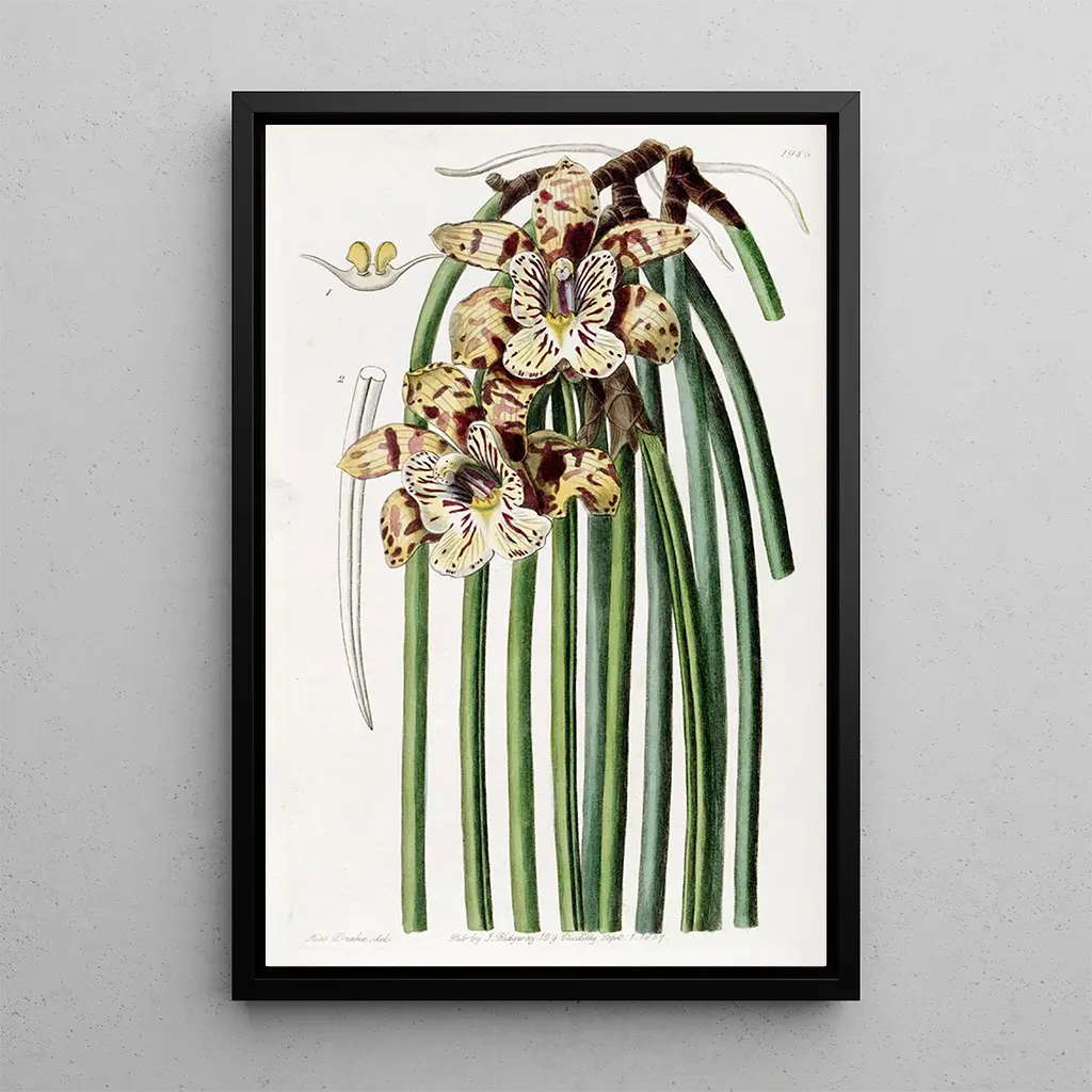 Kunsttrykket "Maxillaria de M. Steels" er et fængslende værk, der fremhæver orkidéernes rigdom. Med sine varme nuancer og delikate former tiltrækker dette lærred straks opmærksomheden. Sydenham Edwards formår gennem sin akvarel at fange essensen af denne blomst og afsløre fascinerende detaljer, der vidner om hans omhyggelige observation. Atmosfæren, der udspringer af dette værk, er både rolig og opkvikkende, hvilket inviterer til en længerevarende eftertanke. Hvert penselstrøg synes at fortælle en historie, nemlig naturens flygtige skønhed.