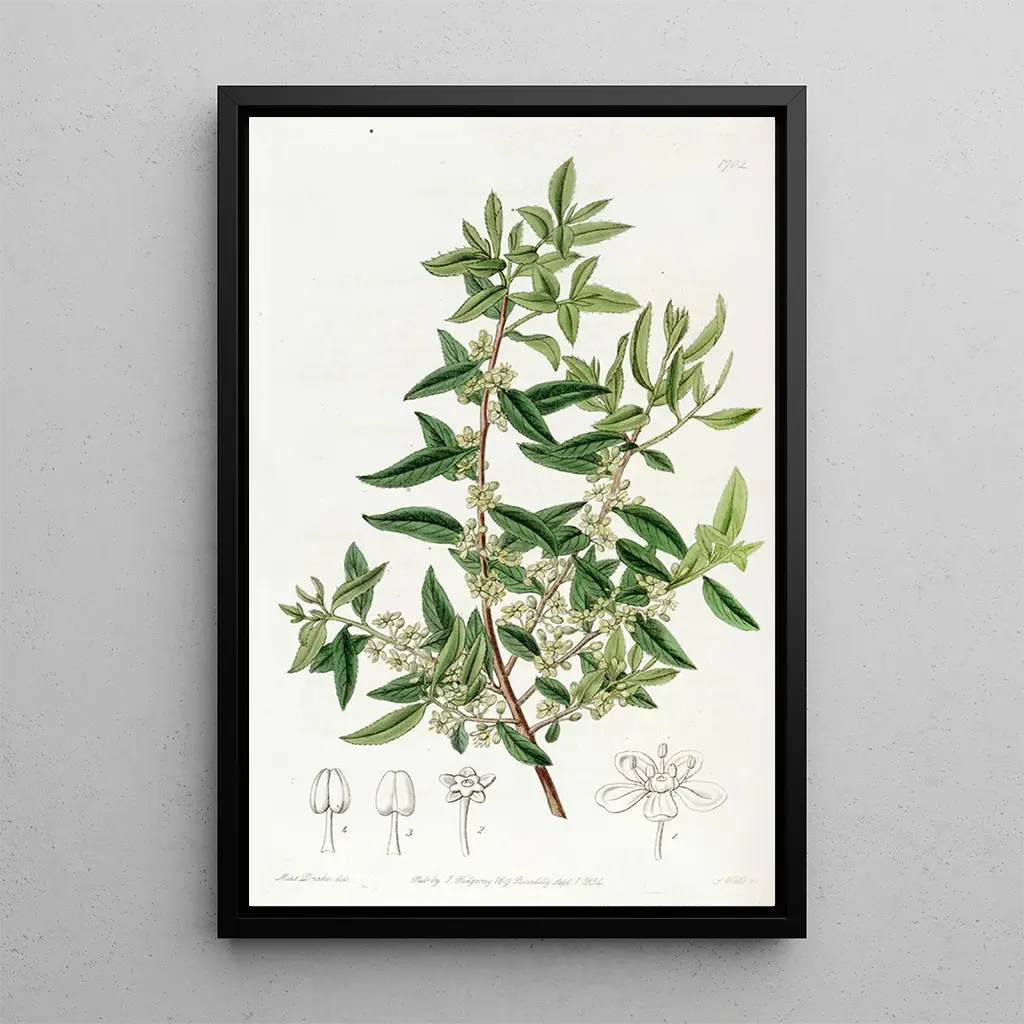 Mayten chilien, omhyggeligt illustreret af Sydenham Edwards, fremstår som et levende maleri, der fejrer skønheden i den chilenske flora. De rige og varierede farver, fra dyb grøn til blid beige, fremkalder mangfoldigheden af naturlandskaber. Akvarelteknikken gør det muligt at fange letheden af bladene og den delikate skønhed af blomsterne, hvilket skaber en atmosfære af ro og friskhed. Dette kunsttryk inviterer til en visuel udforskning, hvor hvert botanisk detalje fremhæves, hvilket afslører naturens kompleksitet og harmoni. Det bliver dermed en ægte hyldest til biodiversitetens rigdom.