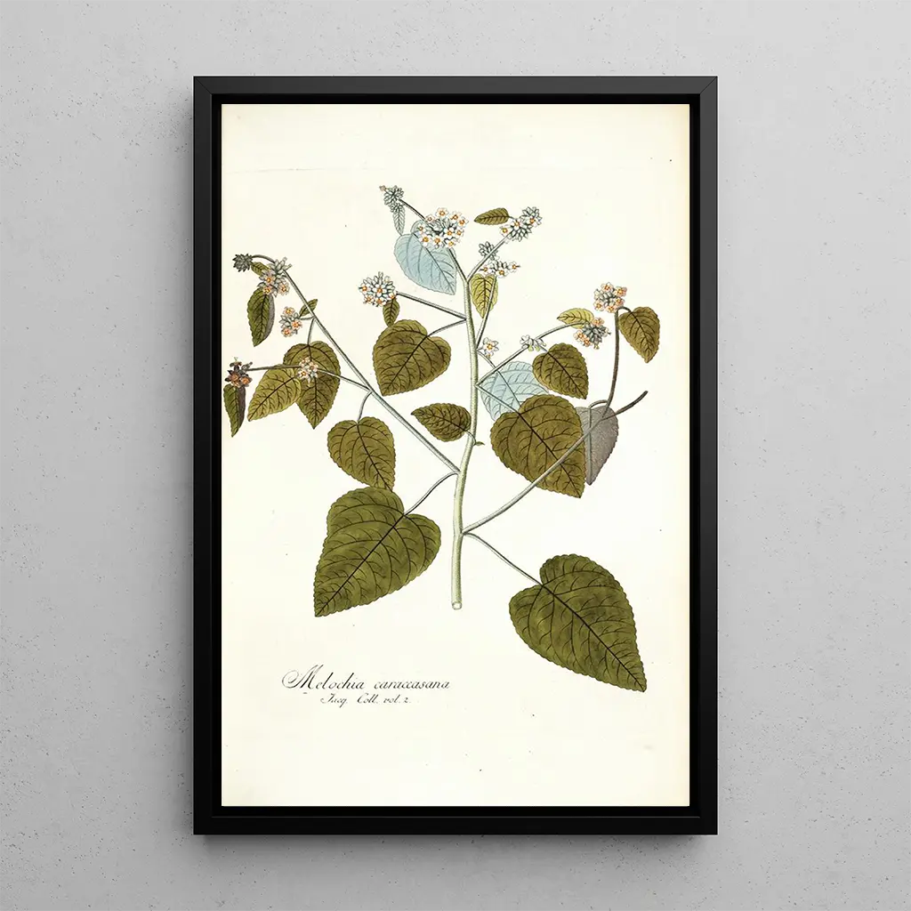 Reproduktionen af Melochia caraccasana, udført af Nikolaus Joseph Freiherr von Jacquin, tager os med ind i en rig og levende planteverden. Dette værk, kendetegnet ved sine grønne nuancer og fine gule nuancer, fremkalder varmen fra tropiske klimaer. Akvarelteknikken, anvendt med finesse, hylder letheden og gennemsigtigheden i bladene. Atmosfæren, der udspringer af dette lærred, er både beroligende og inspirerende, og inviterer betragteren til at dykke ned i den frodende natur og værdsætte de botaniske detaljers pragt.
