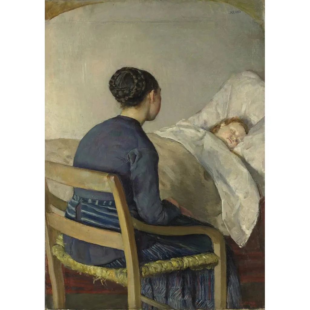 I "Mère ved barnets seng" fanger Christian Krohg et øjeblik af moderlig hengivenhed med en rørende finesse. Szenen, badet i blødt lys, fremhæver moderens beskyttende silhuet, hvis udtryk afslører både bekymring og betingelsesløs kærlighed. Pastelfarver, der blander nuancer af blå og rosa, skaber en beroligende og trøstende atmosfære. Krohgs teknik, der kombinerer realisme og følsomhed, gør det muligt at føle dybden af dette unikke bånd mellem mor og barn, hvilket forvandler dette lærred til en ægte hyldest til moderskabet.