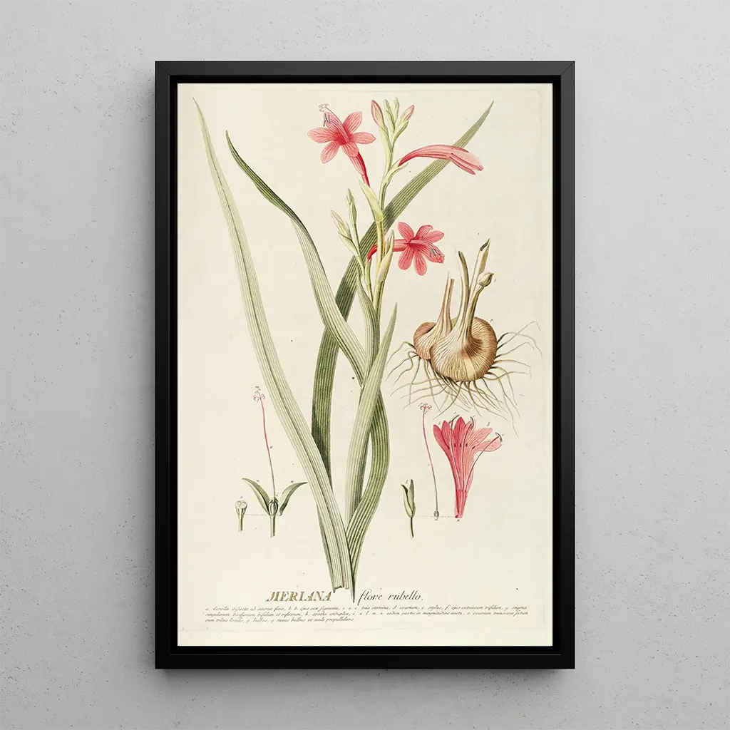 Kunsttrykket af værket Meriana af Georg Dionysius Ehret tager os med ind i en verden, hvor naturen blomstrer med glans. Dette lærred, rigt på detaljer, fremhæver delikate blomster i levende farver, der svinger mellem blid rosa og strålende gult. Den akvarelteknik, som kunstneren mestrer, giver hele værket en let, svævende kvalitet, næsten drømmeagtig. Atmosfæren, der udspringer af dette kunstværk, inviterer til eftertanke og giver betragteren mulighed for at drømme sig væk til en frodig have, hvor hver enkelt petal synes at fortælle en historie.