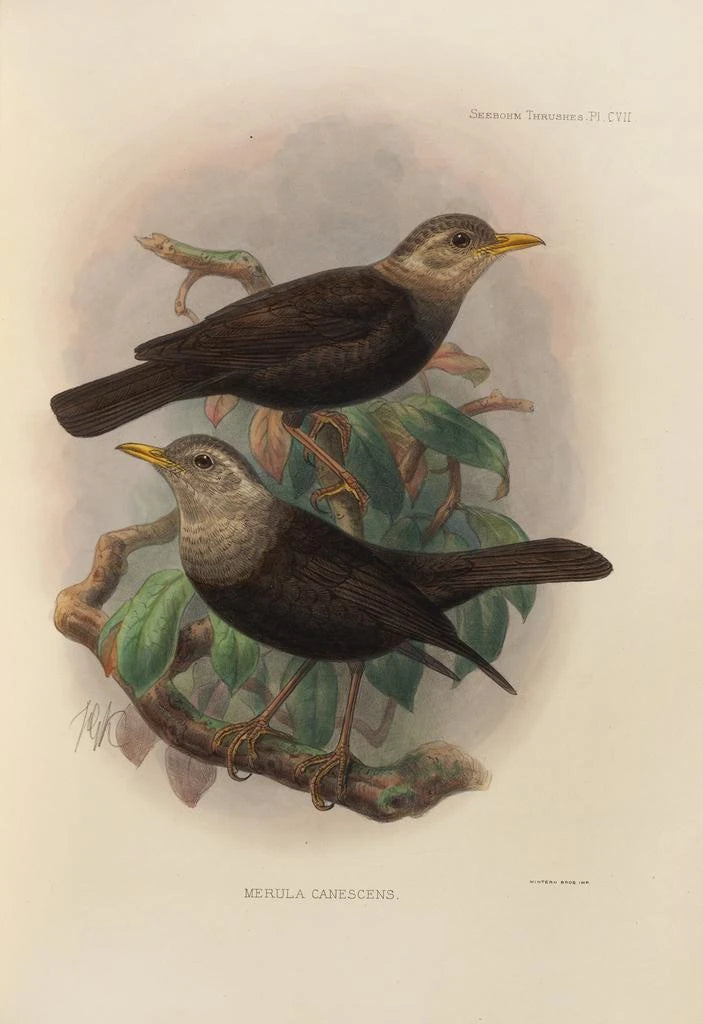 Henry Seebohm, naturforsker og ornitolog fra det XIX. århundrede, formåede at forene passionen for fugle med kunstnerisk talent. Hans værker, herunder Merula Canescens, er en del af en periode, hvor studiet af fugle fik en ny dimension, påvirket af videnskabelige opdagelser og den voksende interesse for naturen. Seebohm rejste verden rundt, indsamlede eksemplarer og viden, der berigede hans kunst. Hans arv består, og markerer en æra, hvor kunst og videnskab forenede sig for at fejre biodiversiteten.