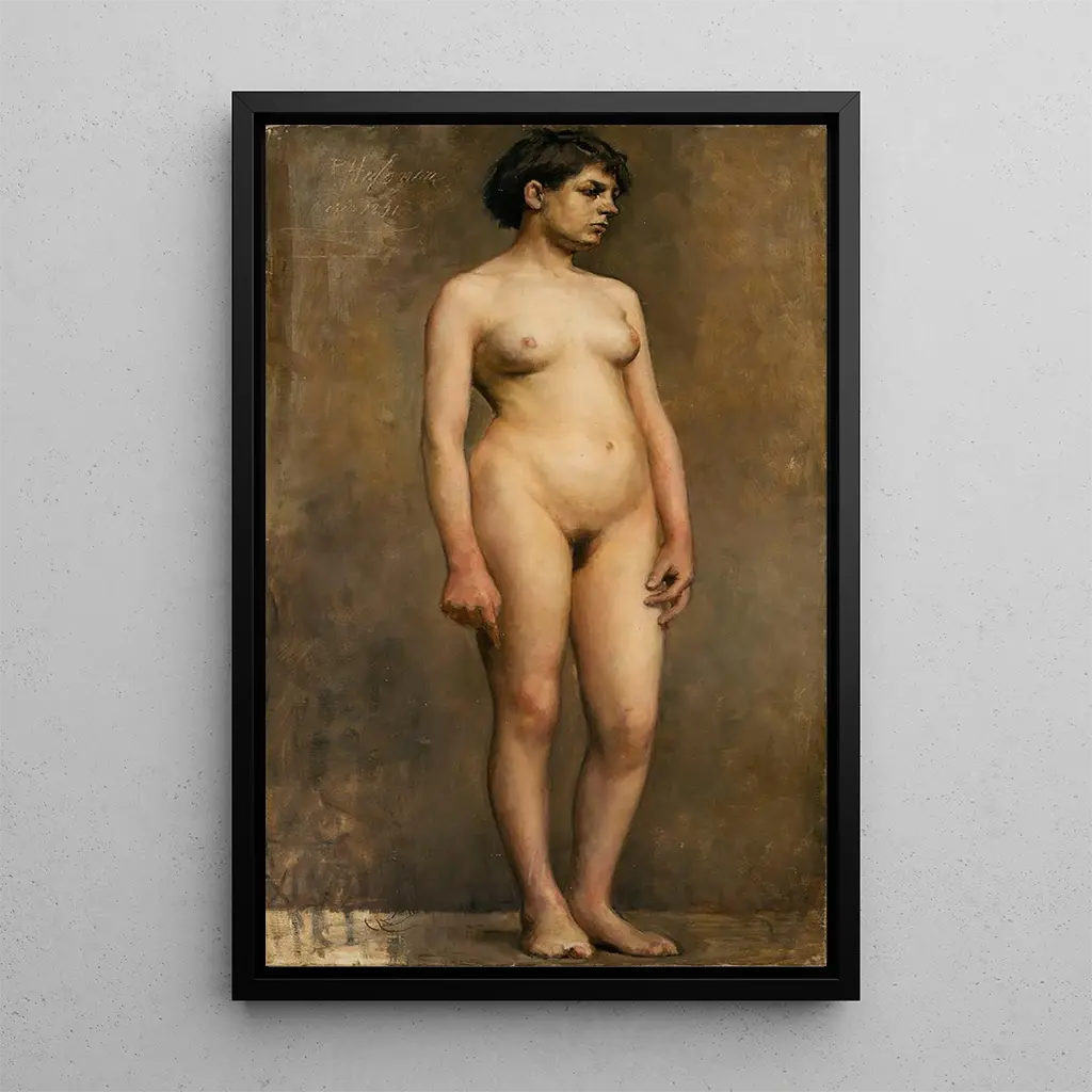 Født i 1865, er Pekka Halonen en ikonisk figur i finsk kunst, anerkendt for sine landskaber og portrætter. Påvirket af den nationale romantiske bevægelse søger han at udtrykke den finske identitet gennem sine værker. Halonen studerede ved Helsingfors Kunstakademi og blev dybt inspireret af den nordiske natur, hvilket afspejles i hans kompositioner. Hans unikke stil, der kombinerer realisme og impressionisme, har gjort ham til en pioner inden for finsk maleri. Kunstværket "Modèle féminin nu" indskriver sig i denne søgen efter kunstnerisk udtryk, hvor den menneskelige skønhed fejres med en særlig følsomhed.