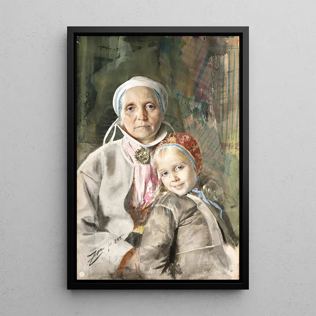 I dette fængslende kunsttryk inviterer Anders Zorn os til at dykke ned i et intimt øjeblik, hvor lyset leger med varme nuancer og delikate skygger. Kompositionen fremhæver to kvindelige figurer, Mona og Karin, hvis udtryk og positurer afslører en stille samhørighed. Nuancer af blå og rosa blander sig harmonisk, hvilket skaber en blid og beroligende atmosfære. Zorns teknik, der kombinerer olie og akvarel, bringer denne scene til live og gør næsten føleligt den emotion, der udspringer heraf. Hvert penselstrøg synes at fange et åndedrag, en tanke, en historie at fortælle.