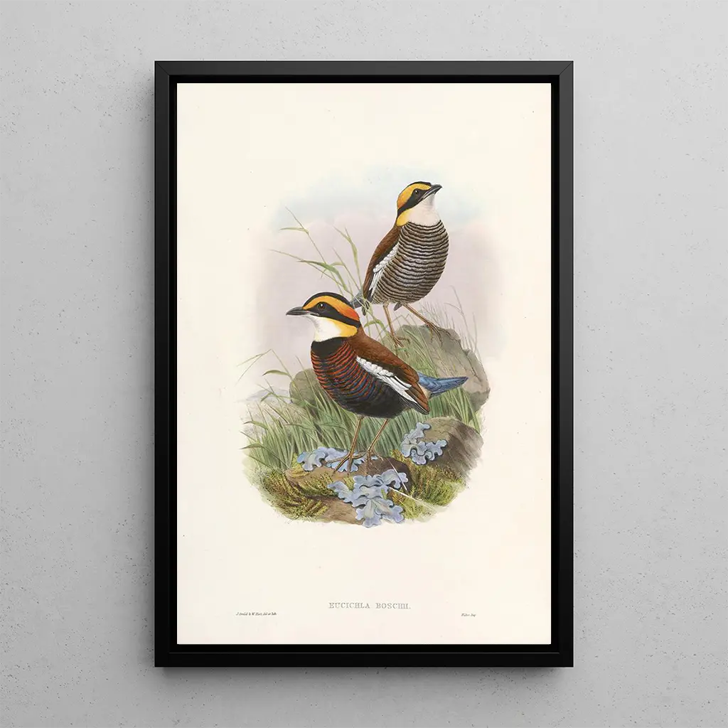 John Gould, en ikonisk skikkelse fra det 19. århundrede, revolutionerede ornitologisk illustration med sin videnskabelige og kunstneriske tilgang. Hans værker, herunder kunsttrykket Monographie des Pittidae, vidner om hans engagement i at afbilde de fuglearter, han mødte på sine rejser, trofast. Påvirket af tidens naturforskning, formåede Gould at forene videnskabelig stringens med kunstnerisk følsomhed, hvilket har skabt værker, der er blevet referencer i ornitologiens verden. Hans arv lever videre og inspirerer mange kunstnere og forskere verden over.