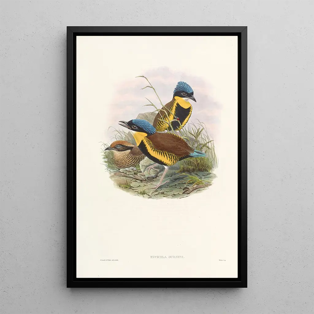 John Gould, en ikonisk skikkelse fra det 19. århundrede, revolutionerede ornitologisk illustration med sin kunstneriske og videnskabelige tilgang. Hans passion for fugle førte til skabelsen af værker med en enestående præcision, såsom kunsttrykket Monographie des Pittidae. Inspireret af tidens opdagelsesrejser formåede Gould at fange essensen af de arter, han portrætterede, og hylde deres skønhed, samtidig med at han bidrog til videnskabelig viden. Hans karakteristiske stil, der kombinerer realisme og følsomhed, har sat et varigt præg på kunst- og videnskabsverdenen og gjort ham til en pioner inden for sit felt.
