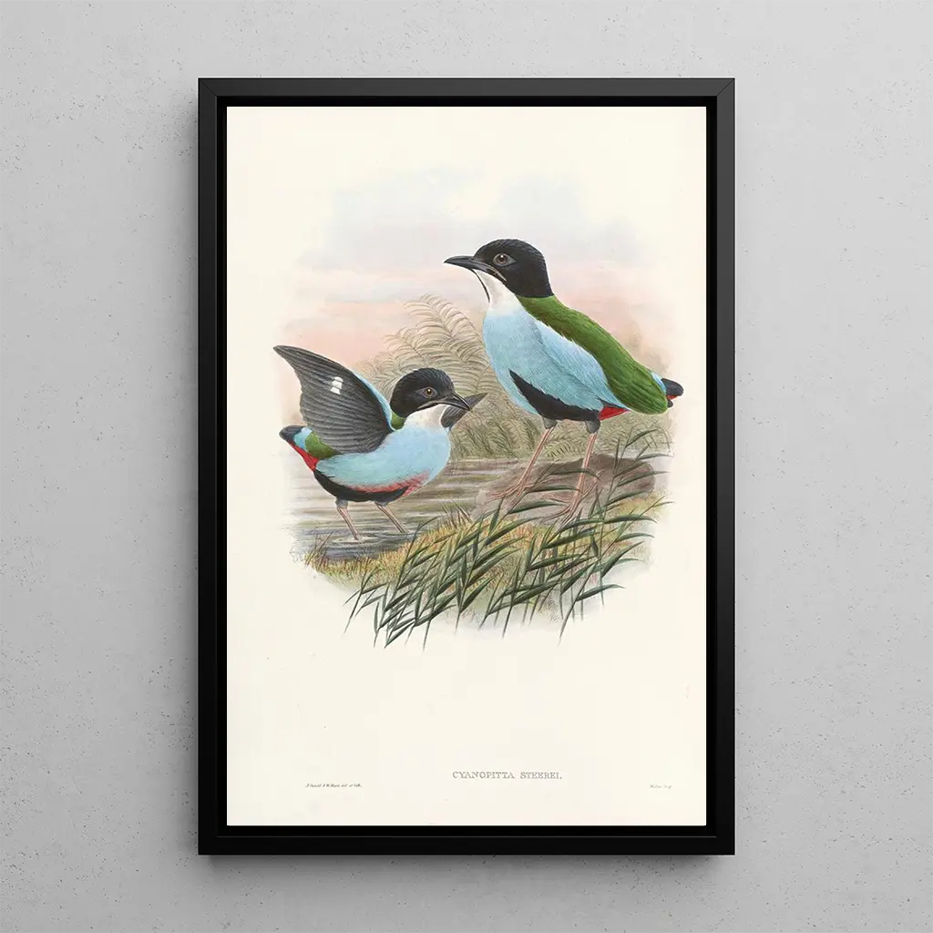 Kunstværket Monographie des Pittidae Pl08 af John Gould er et fængslende værk, der fejrer majestæten af fugle fra familien Pittidae. Med livlige nuancer og præcise detaljer transporterer dette lærred seeren til en rig og levende naturlig verden. Kunstneren excellerer i brugen af farver, hvilket skaber slående kontraster, der fremhæver skønheden i fjerdragten. Goulds delikate teknik, kombineret med hans skarpe observationssans, giver liv til hver enkelt fugl, hvilket gør dette værk både oplysende og æstetisk tiltalende. Det er en sand hyldest til biodiversiteten.