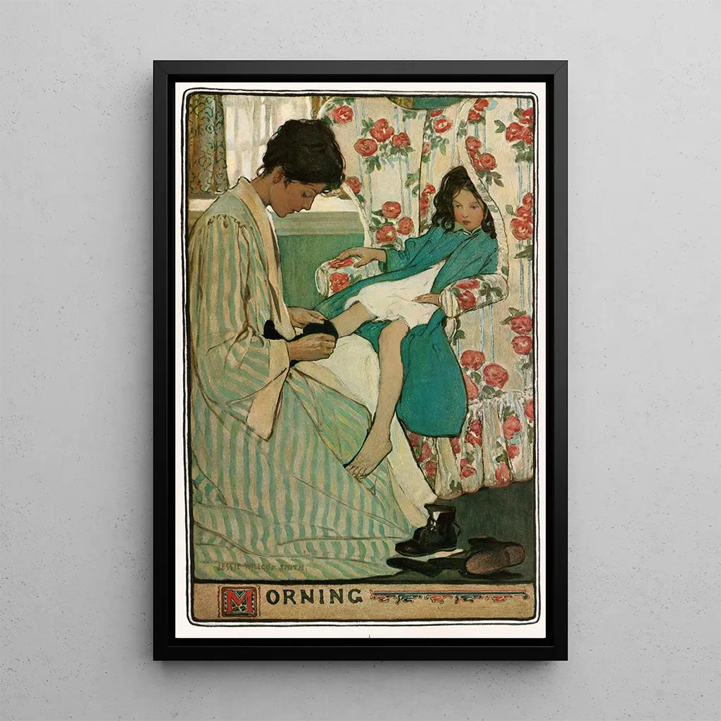 Matin, et fængslende kunsttryk af Jessie Willcox Smith, fremkalder magien ved de første solstråler. Lærredet skildrer en ung pige, omgivet af blidheden i en fredelig morgen, hvor det gyldne lys kærtegner blomster og blade. De varme og lyse farver, kombineret med delikate detaljer, skaber en atmosfære af blidhed og forundring. Kunstnerens teknik, der blander akvarel og pastel, giver denne scene lethed og friskhed, og transporterer betragteren til et hængende øjeblik, hvor tiden synes at stå stille for at værdsætte hverdagens skønhed.