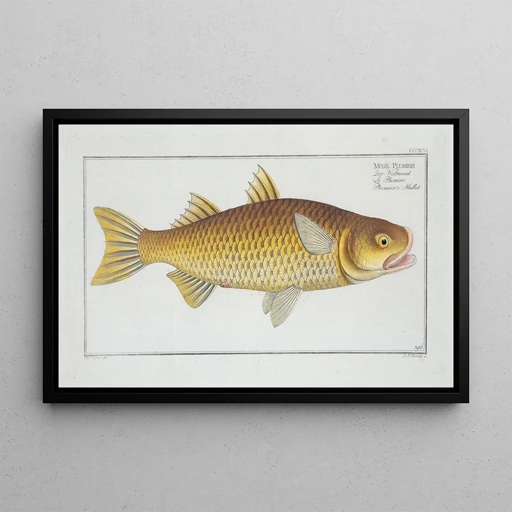 Mugil Plumeri, le Mulet de Plumer : en fascinerende maritim kunsttryk Kunsttrykket af Mugil Plumeri, le Mulet de Plumer, dykker ned i det akvatiske univers takket være Marcus Elieser Blochs præcision og realisme. Dette kunsttryk fremhæver mulet, en ikonisk fisk, gengivet med omhu for anatomiske detaljer. Nuancerne af blå og grøn fremkalder det marine dyb, mens lyset leger over skæl, hvilket skaber en fascinerende glans. Blochs teknik, der kombinerer akvarel og gravure, hylder den undervandsfaunaens skønhed og giver en både videnskabelig og kunstnerisk vision af dette dyr. Marcus Elieser Bloch : pioner inden for kunstnerisk ichthyologi Marcus Elieser Bloch, født i 1723, er en tysk kunstner og naturforsker, berømt for sine bidrag til ichthyologi, studiet af fisk. Hans hovedværk, "Naturgeschichte der ausländischen Fische", blev udgivet mellem 1782 og 1795 og markerede et vendepunkt i fremstillingen af marine arter. Påvirket af tidens videnskabelige opdagelser, formåede Bloch at forene kunst og videnskab, hvilket gjorde hans værker både æstetiske og uddannelsesmæssige. Hans arbejde har haft en varig indflydelse på, hvordan fisk bliver portrætteret i kunsten, og han betragtes som en af de forløbere for illustreret zoologi. En dekorativ genstand med mange fordele Kunsttrykket af Mugil Plumeri, le Mulet de Plumer, er et dekorativt stykke, der vil tiltale naturelskere og videnskabsentusiaster. Perfekt til et kontor, et bibliotek eller endda et køkken, tilføjer dette lærred en maritim elegance til din indretning. Den troværdige reproduktionskvalitet gør det muligt at nyde hver detalje af Blochs værk, samtidig med at det tilføjer en uddannelsesmæssig dimension til dit rum. Med sin visuelle appel og unikke karakter bliver dette kunstværk et centralt fokuspunkt, der vækker nysgerrighed og beundring hos dine gæster.