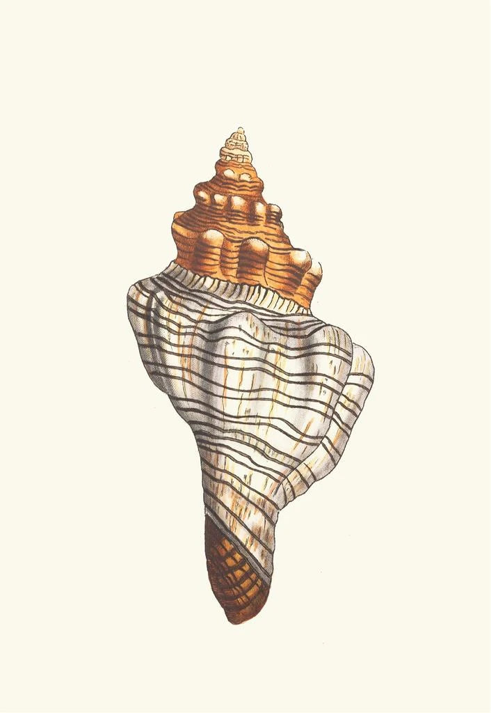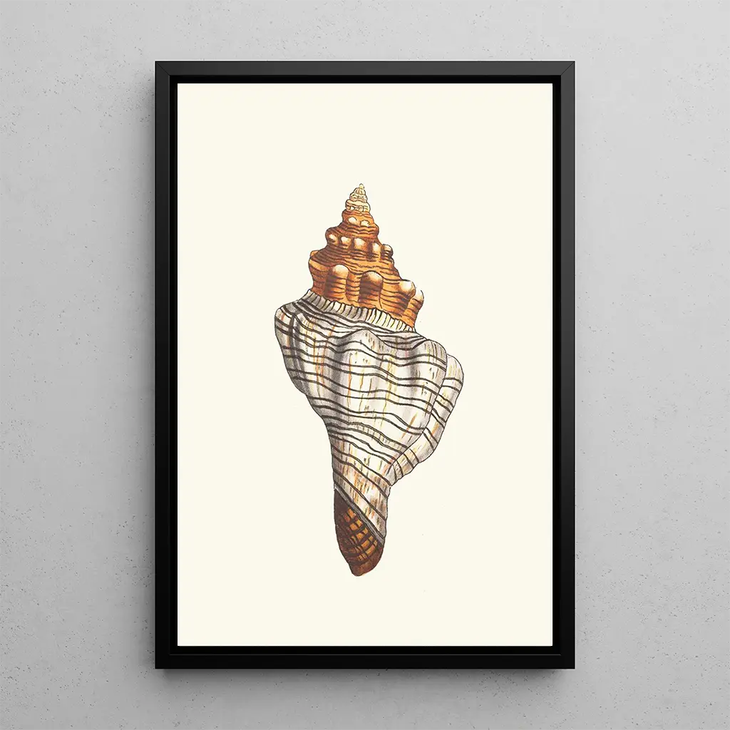 George Shaws Murex trapezium-kunsttryk tager os med ind i den fascinerende verden af marine bløddyr. Med delikate nuancer af beige og rosa fremkalder dette værk den skrøbelige skønhed af livet under havets overflade. Shaw fanger gennem sin omhyggelige teknik de slående detaljer i skallen, hvilket hylder naturens kompleksitet. Atmosfæren, der udspringer af dette lærred, er både beroligende og gådefuld, og inviterer seeren til at udforske mysterierne i havets dyb. Hver kurve og hver stribe på skallen synes at fortælle en historie, en hyldest til biodiversiteten.