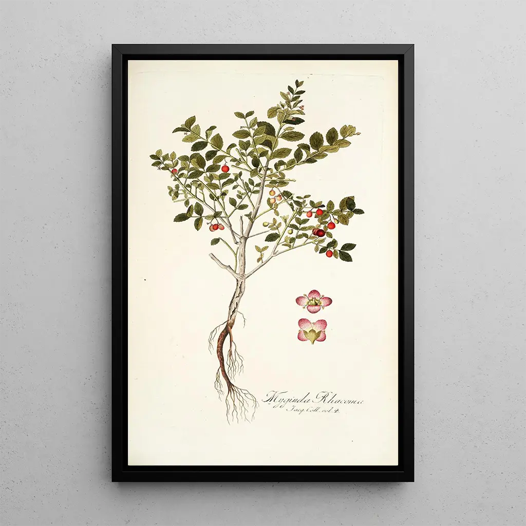 Kunsttrykket af Myginda rhacoma, værk af Nikolaus Joseph Freiherr von Jacquin, tager os med ind i den fascinerende verden af botanik. Dette lærred fremhæver en plante med intrigerende former og delikate farver, der vækker mindelser om den tropiske flora. Akvarelteknikken, mestret af Jacquin, gør det muligt at gengive de subtile nuancer i blade og blomster med præcision. Atmosfæren, der udspringer af dette værk, er både livlig og rolig, og inviterer til en opmærksom betragning af den naturlige skønhed. Hvert detalje er omhyggeligt observeret, hvilket vidner om kunstnerens ekspertise og hans kærlighed til naturen.