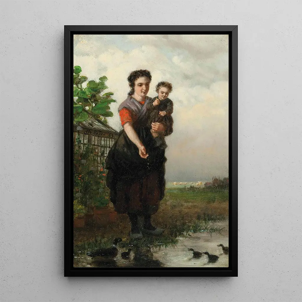 I dette fængslende værk tager Henri van Seben os med til en fredelig scene, hvor tiden synes at stå stille. Den delikate komposition fremhæver en gruppe ænder, der nyder brødkrummer, mens et barn med et strålende smil iagttager dem opmærksomt. De bløde og naturlige farver, der spænder fra beroligende grønne til varme brune nuancer, skaber en atmosfære af fred. Kunstnerens teknik, der kombinerer realisme og impressionisme, inviterer os til at føle den enkle glæde ved at fodre disse dyr, samtidig med at den fejrer naturens skønhed.