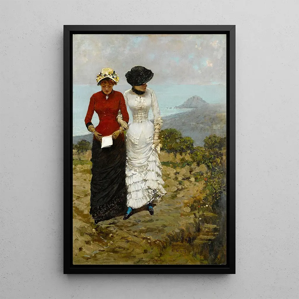 Approchant rendez-vous : en kunsttryk af et øjeblik fyldt med ømhed I "Approchant rendez-vous" fanger Ernest Giroux et flygtigt øjeblik, et møde fuld af løfter. Kompositionen fremhæver en ung kvinde, klædt i en fin kjole, der yndefuldt går mod et mødested. Pastelfarver, der blander bløde nuancer af rosa og blå, skaber en romantisk og drømmende atmosfære. Giroux's teknik, der kombinerer realisme og impressionisme, giver liv til denne scene, næsten håndgribeligt gør den følelserne, der udspringer af den. De omhyggelige detaljer af blomster og det omkringliggende løv tilføjer et strejf af poesi, der inviterer betragteren til at fordybe sig i dette suspendede øjeblik. Ernest Giroux : en maler i hjertet af den romantiske bevægelse Ernest Giroux, aktiv i det XIX. århundrede, er en bemærkelsesværdig repræsentant for den franske romantiske bevægelse. Påvirket af sine samtidige udviklede han en stil, der prioriterer følelser og følsomhed, og som adskiller sig fra de akademiske konventioner i sin tid. Hans værker, ofte inspireret af naturen og menneskelige relationer, vidner om en søgen efter ægthed og skønhed. Giroux formåede at fange essensen af sin tid, præget af en søgen efter individualitet og følelser. Hans kunstværker, såsom "Approchant le rendez-vous", er refleksioner over dagligdagen, samtidig med at de er gennemsyret af en følelsesmæssig dybde, der fortsat berører nutidens betragtere. En dekorativ erhvervelse med mange fordele Kunsttrykket af maleriet "Approchant rendez-vous" er et dekorativt stykke, der vil pryde ethvert rum, hvad enten det er en stue, et kontor eller et soveværelse. Dets trykkvalitet og trofasthed mod de originale farver gør dette lærred til et ideelt valg for dem, der værdsætter romantisk kunst. Det æstetiske tiltrækningskraft ved dette værk ligger i dets evne til at fremkalde følelser og skabe en varm atmosfære. Ved at integrere dette kunsttryk i dit hjem giver du dit rum et strejf af elegance og poesi, samtidig med at du hylder Ernest Giroux's kunstneriske arv.