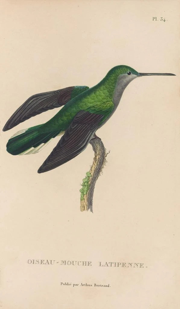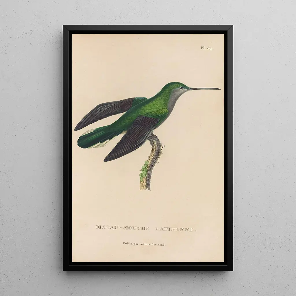 Kunsttrykket Histoire naturelle des oiseaux-mouches Pl34 tager os med ind i et univers fyldt med farver og liv. Humlebier, gengivet med bemærkelsesværdig præcision, ser ud til at lette fra lærredet. De strålende nuancer og de minutiøse detaljer i fjerdragten skaber en dynamisk og fængslende atmosfære. Hvert fugl er et kunstværk i sig selv, der hylder naturens skønhed og artsdiversiteten. Dette værk inviterer til forundring og eftertanke, hvor hvert blik bliver til en ny opdagelse.