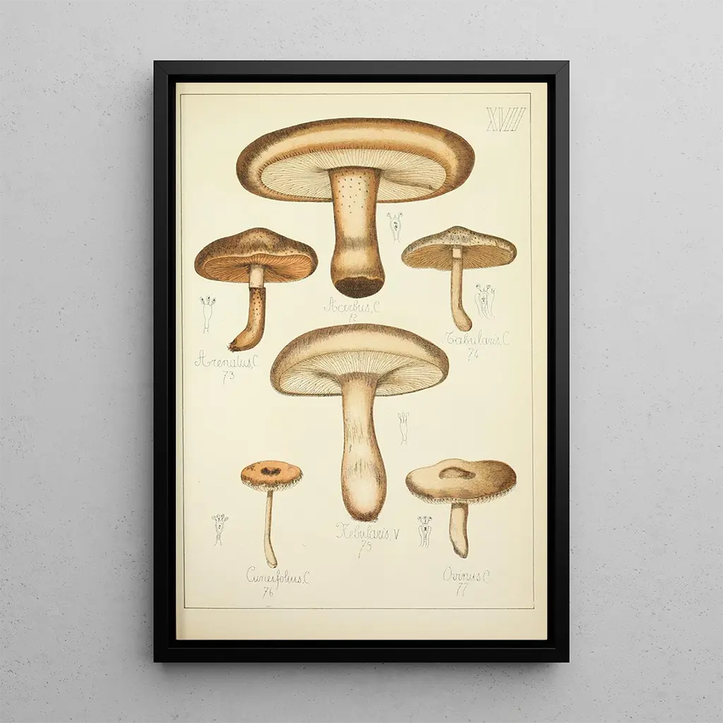 Kunsttrykket Histoire naturelle des champignons Pl17 af Guillaume Sicard tager os med ind i en verden, hvor naturen afslører sine mest intime hemmeligheder. Dette værk, rigt på detaljer, præsenterer en harmonisk sammensætning af svampe, hver omhyggeligt gengivet med jordnære farver og delikate nuancer. Akvarelteknikken, anvendt af Sicard, giver dette lærred en atmosfære, der både er livfuld og beroligende, og inviterer betragteren til en opmærksom eftertanke. De organiske former af svampe, ofte ukendte, blomstrer på papiret og skaber en dialog mellem kunstneren og naturen.