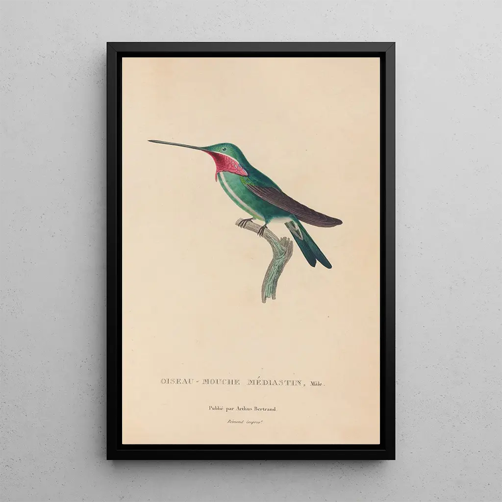 Den kunsttryk Histoire naturelle des oiseaux-mouches Pl29 er et livligt værk, der fanger den flygtige skønhed af fugle-moucher. De strålende farver, fra smaragdgrøn til brændende rød, blander sig harmonisk og skaber en levende og glædelig atmosfære. Den graveringsteknik, René Primevère Lesson anvender, gør det muligt at gengive hver detalje i fjerdragten med bemærkelsesværdig præcision, næsten taktil. Dette lærred inviterer til en opmærksom eftertanke og afslører den delikate ynde og elegance hos disse vingerede skabninger, samtidig med at det fremkalder en rig og fascinerende naturlig verden.