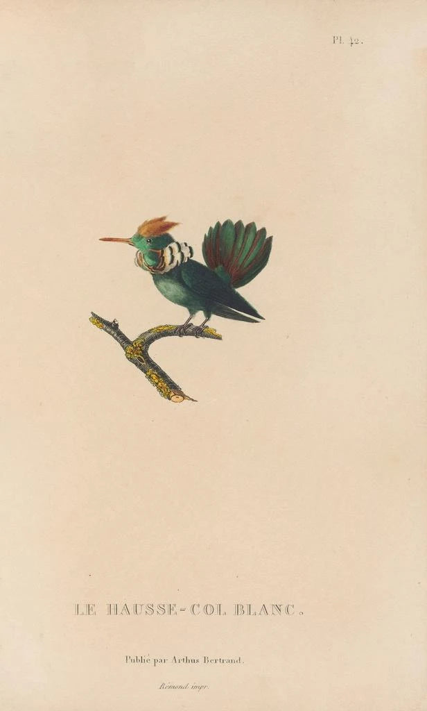 René Primevère Lesson, naturforsker og ornitolog fra det XIX. århundrede, spillede en afgørende rolle i studiet af fugle, især eksotiske arter. Hans arbejde er en del af en periode med videnskabelige opdagelser og forundring over biodiversiteten. Påvirket af tidens opdagelsesrejser formåede han at forene videnskab og kunst, og skabte værker, der både er videnskabelige dokumenter og kunstværker. Histoire naturelle des oiseaux-mouches, hvor dette kunsttryk indgår, vidner om hans engagement i at fange skønheden i den naturlige verden, samtidig med at han bidrog til ornitologisk viden.