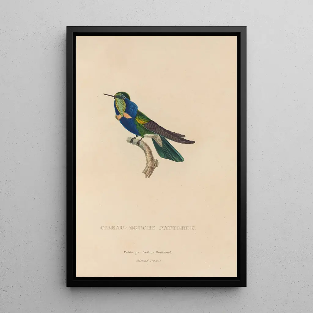 Kunsttrykket "Histoire naturelle des oiseaux-mouches Pl16" af René Primevère Lesson tager os med til en verden, hvor naturen udtrykker sig med glans. Fuglene, gengivet med bemærkelsesværdig præcision, fremviser fjerdragter i varierede nuancer, fra dybblå til strålende gul. Den dynamiske komposition i dette værk fremkalder bevægelse og lethed, som om fuglene er klar til at lette. Lesson's teknik, der kombinerer videnskabelig stringens med kunstnerisk følsomhed, skaber en fængslende atmosfære, der inviterer betragteren til at værdsætte skønheden i disse vingerede væsener.