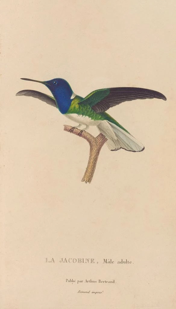 René Primevère Lesson, naturforsker og illustratør fra det 19. århundrede, spillede en vigtig rolle i dokumentationen af fuglearter. Hans arbejde er en del af ornitologi-bevægelsen, hvor videnskabelig præcision kombineres med æstetisk kunstnerisk udtryk. Påvirket af tidens opdagelser og rejser rundt om i verden, formåede han at fange essensen af fuglene, især dem fra tropiske områder. Hans kunsttryk "Histoire naturelle des oiseaux-mouches" er et vidnesbyrd om hans engagement i at repræsentere biodiversitet med præcision og skønhed, og markerer dermed en vigtig del af naturalistisk kunsthistorie.