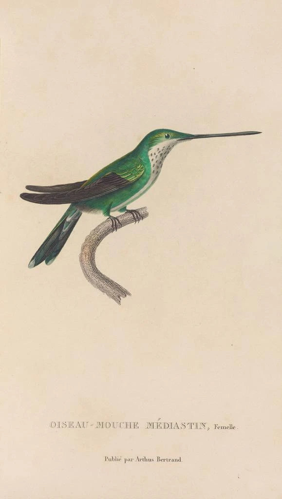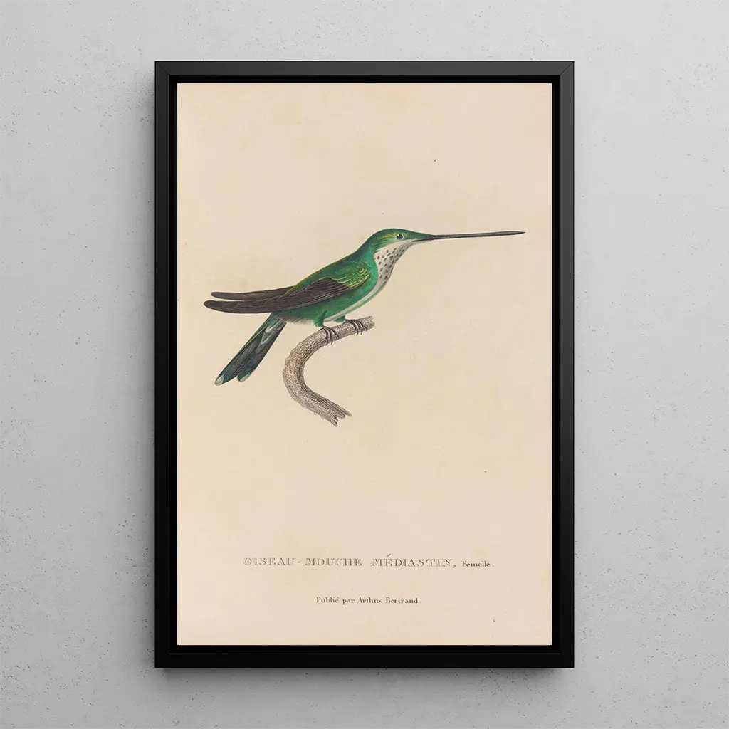 Den kunsttryk Histoire naturelle des oiseaux-mouches Pl30 er et fascinerende værk, der fremhæver mangfoldigheden og skønheden af fuglenes finesse. De skiftende nuancer, der spænder fra dybblå til strålende gule, skaber en dynamisk og glædesfyldt stemning. René Primevère Lessons graveringsteknik gør det muligt at fange de fine detaljer i fjerdragten med præcision, hvilket afslører disse fugles ynde og elegance. Dette lærred inviterer til en visuel udforskning, der fejrer den naturlige verdens rigdom og magien ved de vingerbærende væsener.