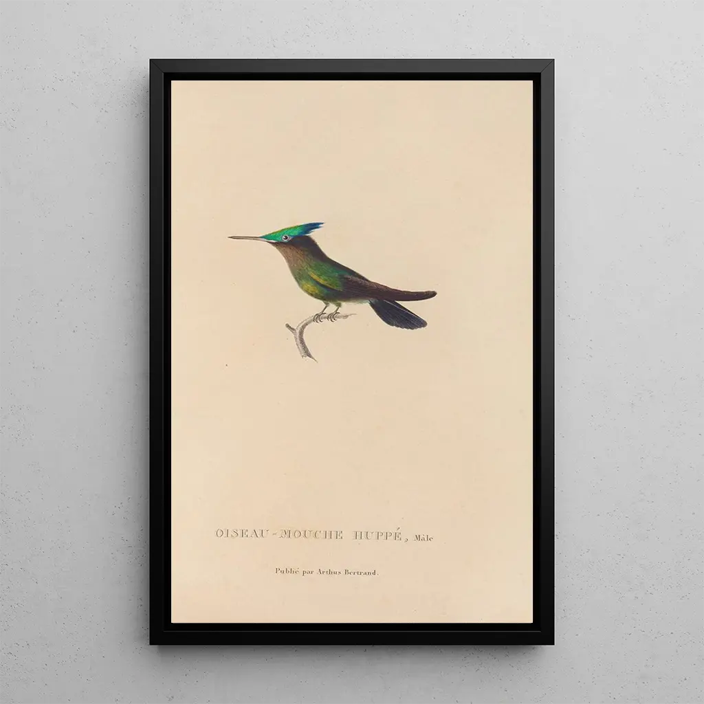 kunsttryk "Histoire naturelle des oiseaux-mouches Pl31" af René Primevère Lesson er en sand hyldest til fuglenes skønhed. Dette kunsttryk illustrerer med bemærkelsesværdig præcision en fugl i fuld flugt, dens delikate vinger vibrerende af strålende farver. Nuancer af grøn, blå og gul blandes harmonisk, hvilket skaber en let og luftig atmosfære. Lithografiteknikken gør det muligt at gengive hver detalje med finesse, fra fjer til iriserende reflekser, og transporterer betragteren til en verden, hvor naturen og kunsten mødes. Dette lærred inviterer til eftertanke og forundring over biodiversitetens rigdom.