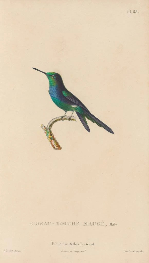 Kunsttrykket Histoire naturelle des oiseaux-mouches Pl69 tager os med ind i et levende univers, hvor letheden af kolibrierne blander sig med en palette af strålende farver. Hvert detalje er omhyggeligt gengivet, fra de fine fjer til de skinnende nuancer, der næsten synes at vibrere under lyset. Den graveringsteknik, René Primevère Lesson anvender, gør det muligt ikke blot at fange det fysiske udseende af disse fascinerende væsener, men også den muntre atmosfære i deres naturlige habitat. Dette kunsttryk inviterer til en opmærksom betragning, hvor hvert blik afslører en ny facet af den ornitologiske skønhed.