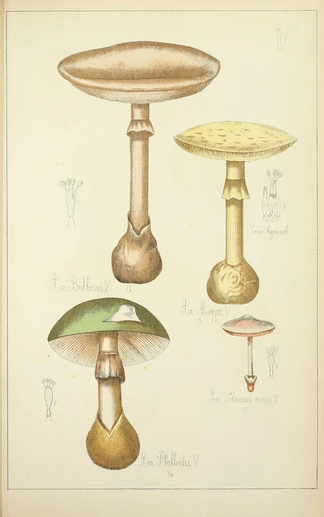 Guillaume Sicards værk "Histoire naturelle des champignons Pl05" er en sand fejring af den svampe mangfoldighed. Dette kunsttryk skiller sig ud med sine livlige farver og varierede former, der fanger øjet og vækker nysgerrigheden. Den graveringsteknik, Sicard bruger, gør det muligt at gengive hver detalje med slående præcision, fra fine konturer til subtile nuancer. Atmosfæren, der udspringer af dette lærred, er både videnskabelig og poetisk, hvilket inviterer betragteren til at udforske en ofte usynlig verden. Hvert svampe ser ud til at være iscenesat, som en skuespiller i et naturligt stykke, klar til at afsløre sine hemmeligheder.