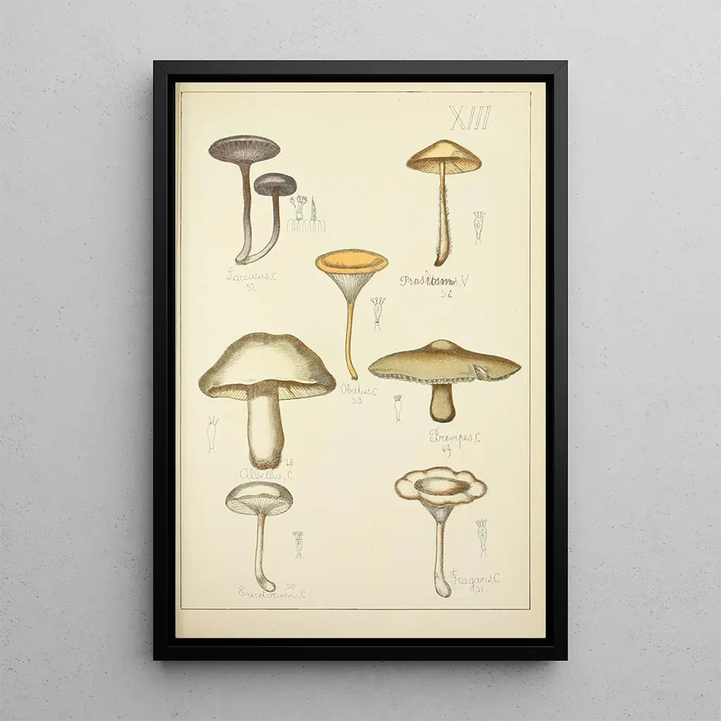 Kunsttrykket Histoire naturelle des champignons Pl13 af Guillaume Sicard tager os med ind i en verden, hvor naturen afslører sig med en sjælden finesse. De jordfarvede nuancer og de levende skift i svampene fremhæves gennem en omhyggelig graveringsteknik, der skaber en atmosfære, der er både videnskabelig og poetisk. Hvert eneste detalje, fra de organiske former til de delikate teksturer, inviterer til en opmærksom betragning, der afslører den skjulte skønhed i disse ofte ukendte organismer. Dette værk er meget mere end blot en illustration; det er en hyldest til mangfoldigheden og kompleksiteten i den svampeverden.