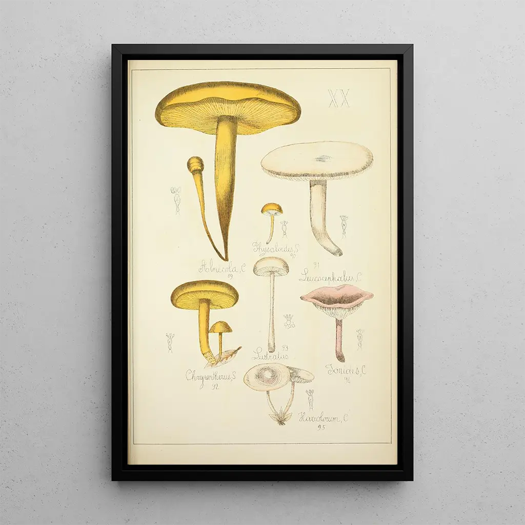 Den kunsttryk Histoire naturelle des champignons Pl20 af Guillaume Sicard tager os med ind i en verden, hvor mangfoldigheden af svampe bliver fremhævet. Dette maleri, rigt på farver og teksturer, viser en imponerende variation af arter, hver fanget med bemærkelsesværdig præcision. De livlige nuancer og de fine detaljer skaber en atmosfære, der både er levende og beroligende, og inviterer betragteren til at udforske naturens vidundere. Teknikken med akvarel, brugt med mesterlighed, understreger den delikate og flygtige skønhed af disse fascinerende organismer, og tilbyder en ægte hyldest til mykologi.