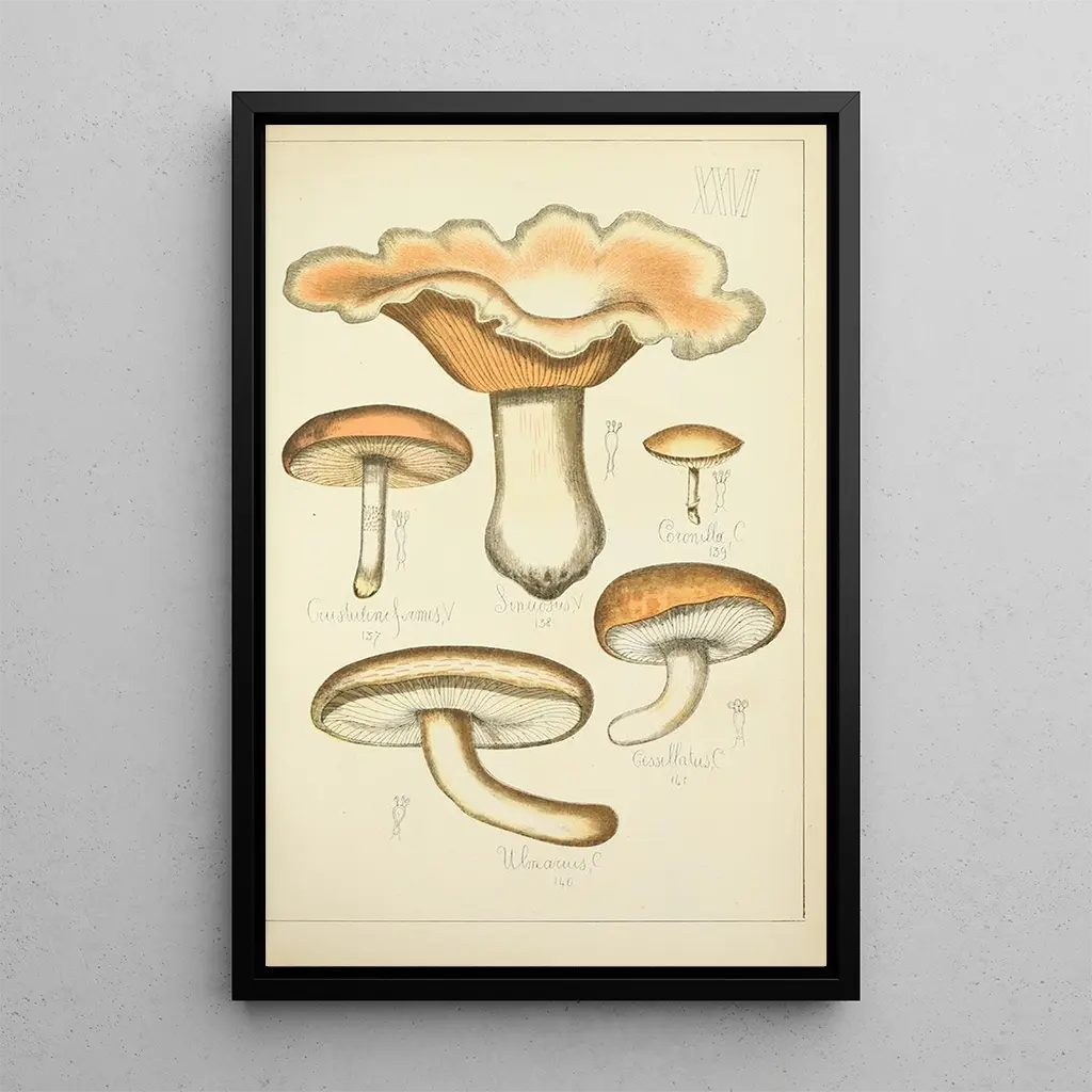 Den kunsttryk af værket Histoire naturelle des champignons Pl26 af Guillaume Sicard tager os med ind i en verden, hvor hver svamp er et kunstværk i sig selv. De livlige nuancer og de fine detaljer afslører mangfoldigheden af arter, mens den harmoniske sammensætning skaber en følelse af lethed. Graveringsteknikken, som Sicard mestrer, gør det muligt at gengive hver svamp med bemærkelsesværdig præcision, hvilket inviterer betragteren til at værdsætte naturens skønhed set fra en ny vinkel.
