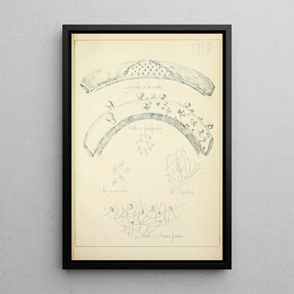 Kunsttrykket Histoire naturelle des champignons Pl75 af Guillaume Sicard tager os med ind i en mystisk og delikat verden. Dette værk, rigt på detaljer, fremhæver en palette af jordfarvede nuancer, fra dybe brune til strålende grønne, der afspejler mangfoldigheden af svampe. Sicards teknik, der kombinerer akvarel og tegning, giver hvert svamp en næsten taktil tekstur, hvilket inviterer betragteren til at komme tæt på og observere. Atmosfæren, der udspringer af dette lærred, er både beroligende og fascinerende, som en gåtur gennem en fortryllet skov, hvor hver art fortæller en historie.