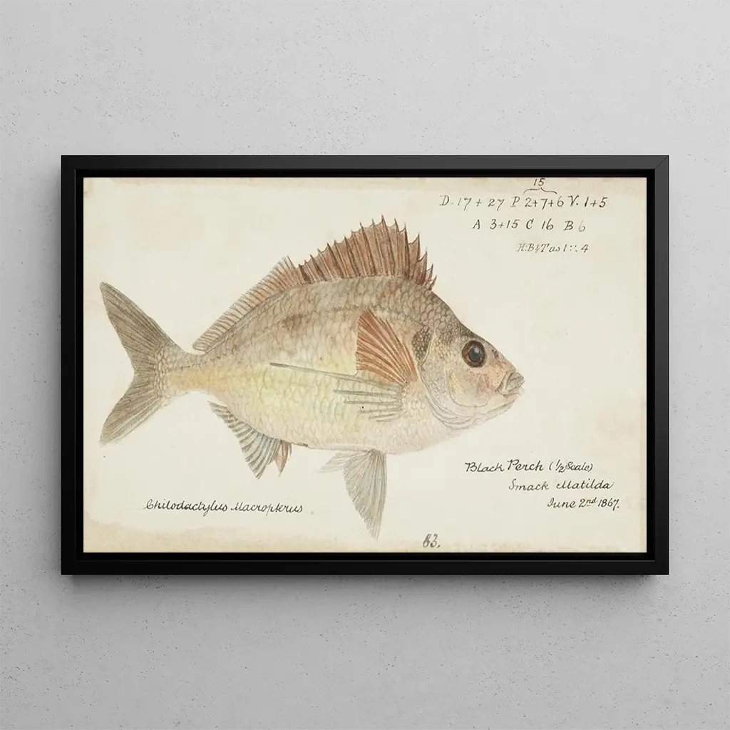 Dette kunsttryk af Nemadactylus macropterus er et dekorativt stykke, der vil berige ethvert rum, uanset om det er en stue, et kontor eller et soveværelse. Dets trykkvalitet sikrer en enestående trofasthed over for farver og detaljer i det originale værk, hvilket giver mulighed for at nyde dets æstetiske appel fuldt ud. Ved at integrere dette maleri i din indretning tilføjer du et strejf af maritim elegance og en invitation til ro. Dette dekorative valg vil uden tvivl vække nysgerrigheden hos dine gæster og skabe en beroligende atmosfære, samtidig med at det hylder naturens skønhed.
