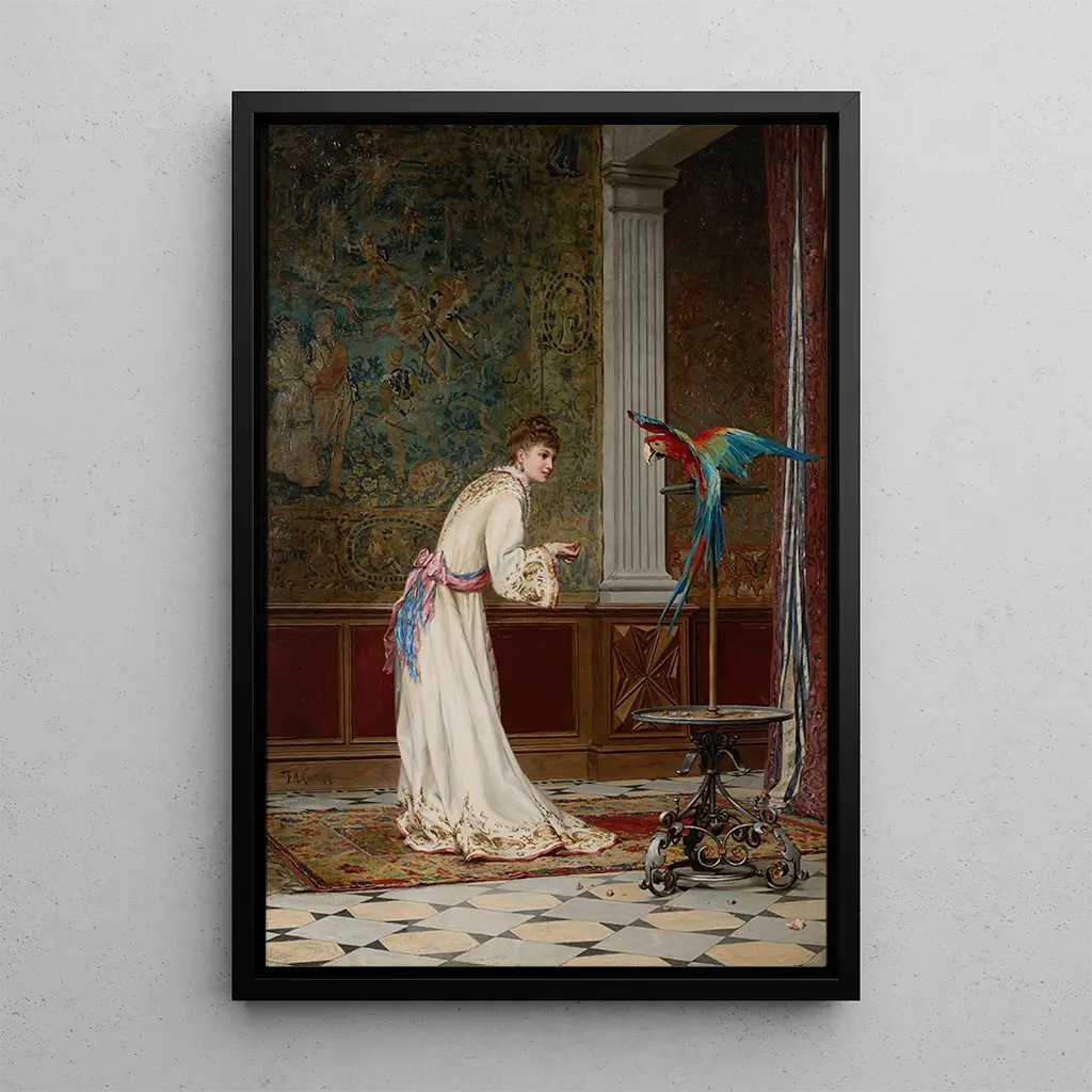 I dette fængslende værk, "Nourgning af Ara", dykker Frederik Hendrik Kaemmerer ned i hjertet af en livlig og farverig scene. Lærredet skildrer en kvinde i fineste tøj, der tilbyder frø til en farverig ara. De strålende nuancer af fuglen står i kontrast til de bløde toner i det omkringliggende landskab, hvilket skaber en varm og indbydende atmosfære. Kaemmerers teknik, der kombinerer realisme og romantik, gør det muligt at føle den ømhed, der deles mellem menneske og dyr. Hvert detalje, fra araens fjer til kvindens udtryk, er gengivet med en præcision, der inviterer til eftertanke.