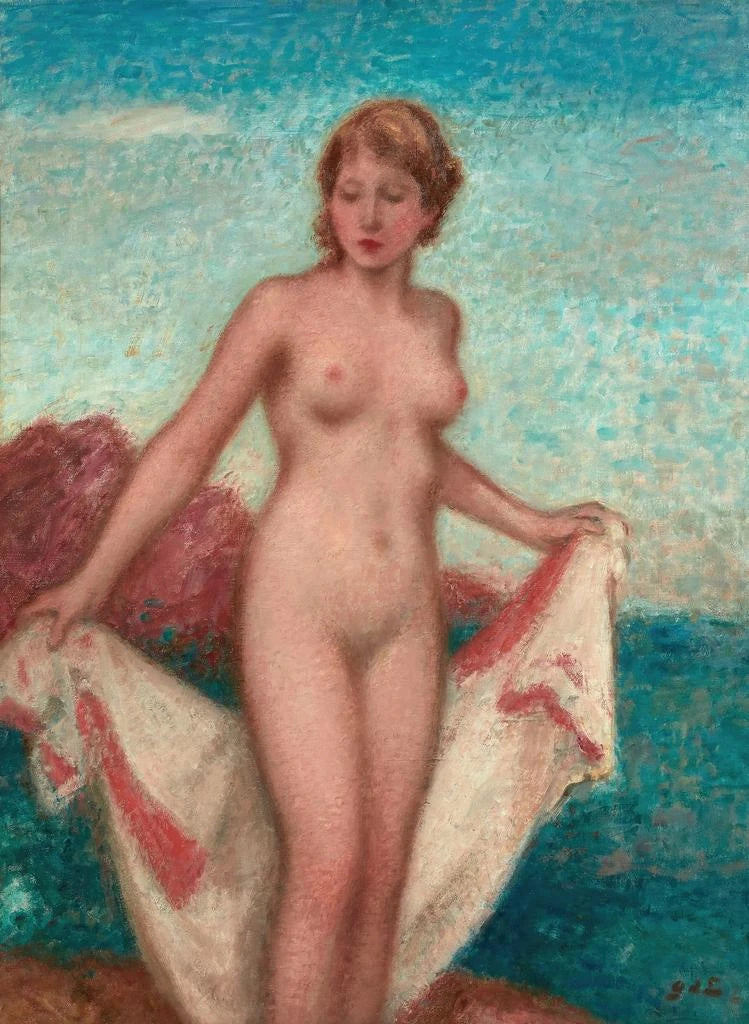 Georges d'Espagnat, født i 1870, er en fransk maler, der har markeret sig med sin unikke tilgang til impressionismen. I en kunstnerisk kontekst i fuld forandring blev han påvirket af tidens store mestre, samtidig med at han udviklede sin egen stil. Hans skabelsesperiode strækker sig fra 1890'erne til 1940'erne, og han har ofte udforsket temaer relateret til naturen og den menneskelige figur. "Nu aux rochers rouges" illustrerer hans interesse for at repræsentere den kvindelige krop, samtidig med at han integrerer landskabselementer, der styrker harmonien mellem mennesket og dets omgivelser.