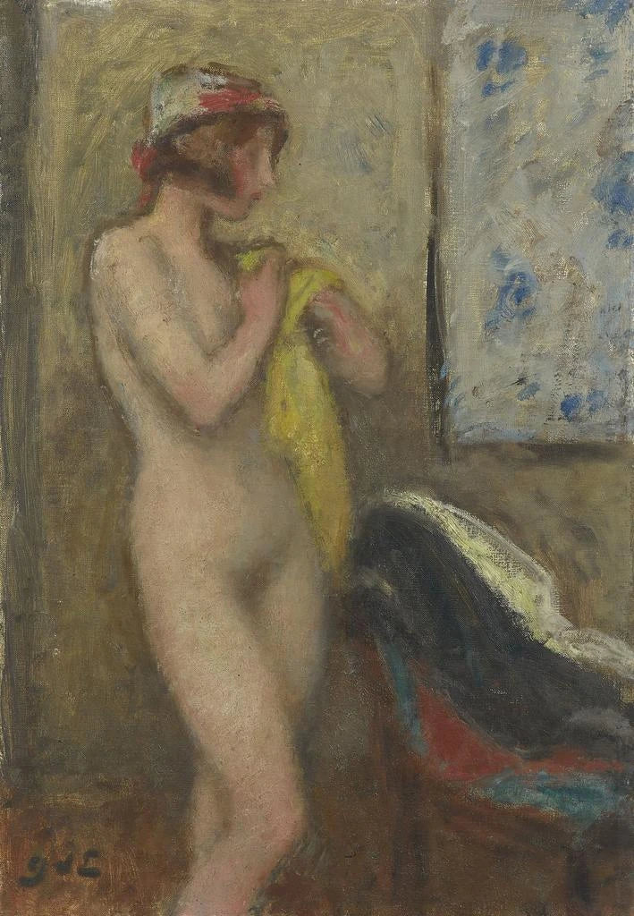 Georges d'Espagnat, aktiv i begyndelsen af det 20. århundrede, er kendt for sin unikke stil, der forener impressionisme og modernisme. Påvirket af kunstnere som Monet og Renoir, udvikler han en personlig tilgang, der fremhæver lys og farve. Hans værker, ofte centreret omkring natur- og menneskefigurer, vidner om en tid, hvor kunsten frigør sig fra akademiske konventioner. "Nu stående" er en del af denne søgen efter kunstnerisk frihed, hvilket understreger vigtigheden af individuel udtryk i hans tids kunstlandskab.