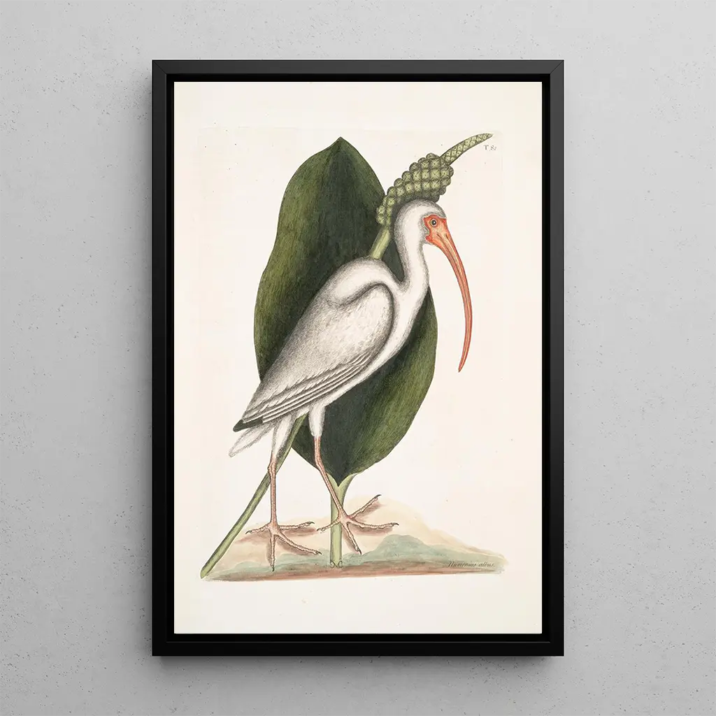 Kunsttrykket "Numenius albus" af Mark Catesby fanger den ynde, den hvide kurle udstråler i et majestætisk flyvningsøjeblik. De bløde farver i dens fjerdragt, der spænder fra ren hvid til cremetoner, fremhæves fint af en subtil grøn baggrund. Den akvarelteknik, Catesby anvender, giver værket en let og luftig atmosfære, der inviterer betragteren til at værdsætte naturens skønhed. Hvert detalje, fra fjer til solreflekser, er omhyggeligt gengivet, hvilket skaber en livagtig scene, der næsten synes at være i bevægelse.