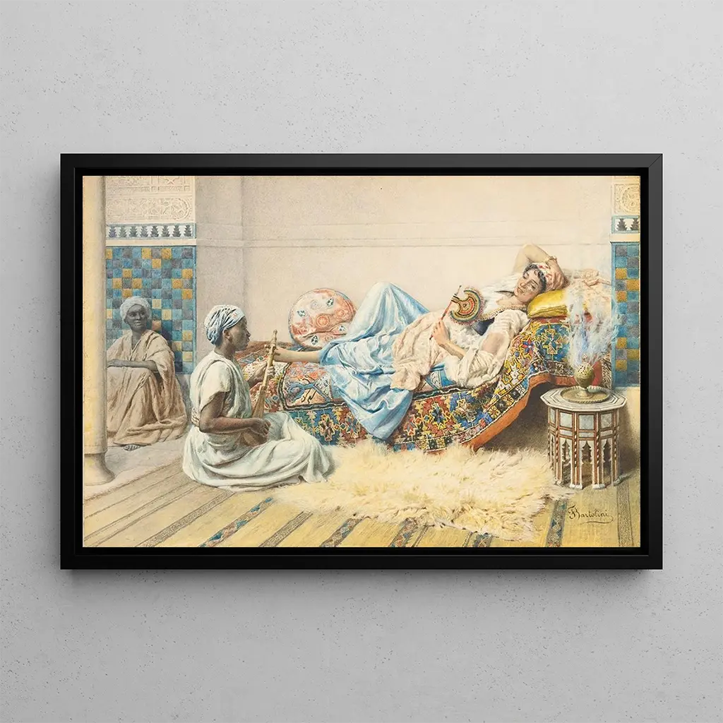 L'Odalisque, etiketværket af Federico Bartolini, fremkalder en delikat sensualitet og en drøm om Orienten. Kompositionen fremhæver en liggende kvinde, omgivet af overdådige draperinger og eksotiske mønstre. De rige farver, der spænder fra varme nuancer til dybe toner, skaber en intim og mystisk atmosfære. Bartolinis teknik, kendetegnet ved flydende penselstrøg og særlig opmærksomhed på detaljer, giver liv til denne kvindefigur, samtidig med at den formidler en følelse af ro og fred. Dette kunsttryk inviterer til eftertanke og flugt til en verden af skønhed.